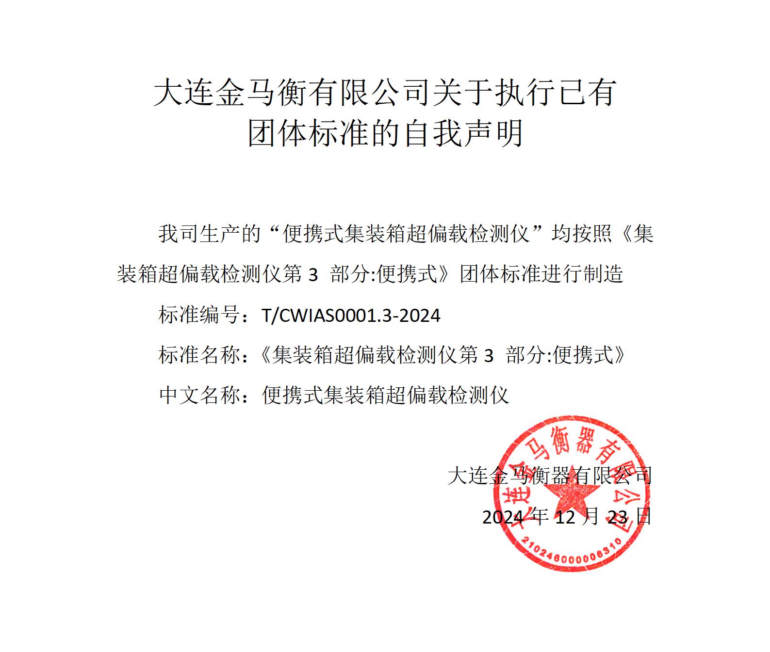 【聲明】大連金馬衡有限公司關(guān)于執(zhí)行已有團(tuán)體標(biāo)準(zhǔn)的自我聲明